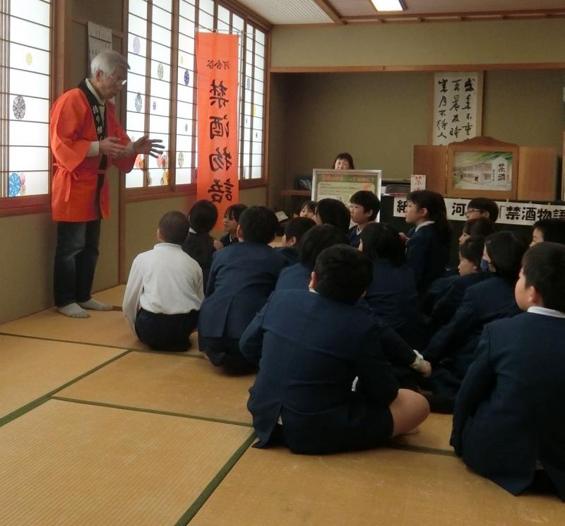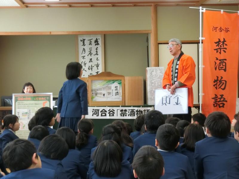 これは、3年生が総合的な学習「英田の誇りを伝えよう」の一環として、河合谷地区に伝わる「禁酒物語」を学ぶために行われたもので、「河合谷禁酒を語り継ぐ会」の方々にお越しいただき、鑑賞させてもらいました。
