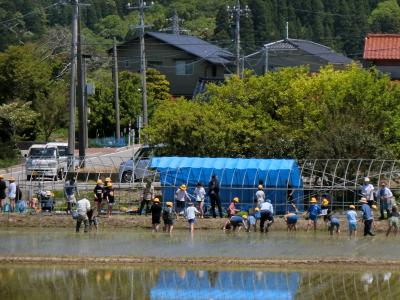 5月8日、五月晴れの中、5年生が学校近くの田んぼをお借りして、田植え体験を行いました。
