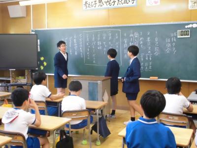 ◆ だれかがうるさかったら、6年生がすぐ、やさしく「しずかにして」といっているところがすてきだと思っていたのでまねしたいです。6年生の考えた「名前くじ」というゲームで(中略)1年生がはずかしがっていたら6年生がサポートしていたので、そういうところもまねしたいです。