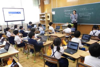 学校では、一人一台タブレット端末を町からお借りして、学習に活用しています。