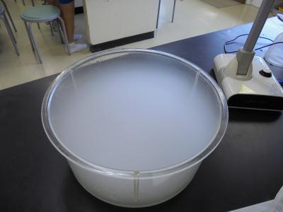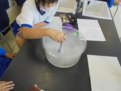 今日は5年の理科で,ミニ台風つくりに挑戦しました。雲の代わりにドライアイスを使い,水を入れた丸水槽の中で霧を発生させます。このままではただの霧なので,薬さじを使って渦を作っていきます。周りをぐるぐる回すより,中心の方で回転させる方がより台風ぽくなるようです。今日は薬さじを使いましたが,ドライヤーなどでゆっくり風を当ててもよいかもしれませんね。