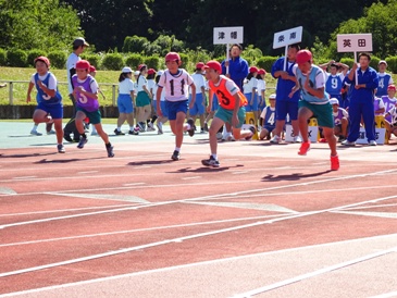 津幡町歌集団演技、100m走、8の字とび、ロケットボール投げ、学校対抗リレーの5つの種目に全力で頑張りました。