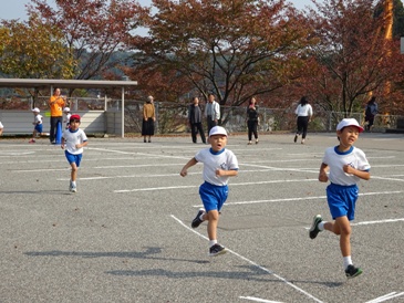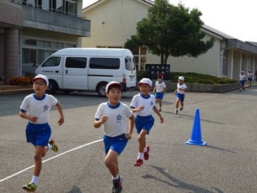 運動場と校地内を周回するコースを、1.2年生は1周で1000m、3.4年生は2周で2000m、5.6年生は3周で3000mを走ります。