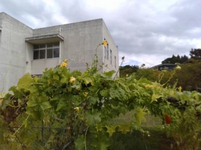 学校には、4年生が植えた「ヘチマ」があります。夏休みの間にぐんぐんツルを伸ばし、ヘチマの棚は一面葉っぱに覆われています。それとともに、黄色い花も咲き始めました。
