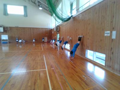 高学年は集団演技の中にある、「逆立ち」の練習に取り組みました。普段逆立ちをする機会はほぼありませんね。そこで壁を使って、徐々に脚を上げ、逆立ちの姿勢の感覚をつかみました。