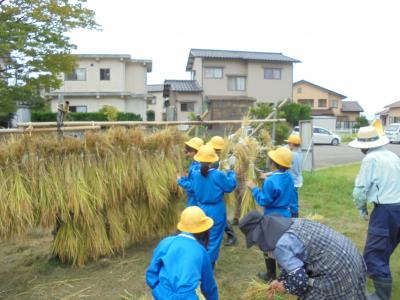 刈り取った稲は学校まで運んでいただき,はさがけをしました。