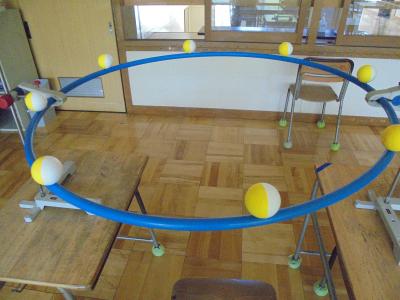 子どもたちは理科室の真ん中に座り(地球の位置),その周りに沿って月の模型を動かしていきます(月の公転)。そうすると光源装置と月の位置関係によって,新月→三日月→半月(上弦)→満月→半月(下弦)と形が変わっていく様子が分かります。