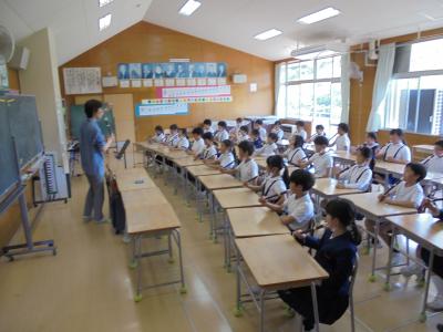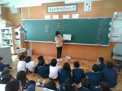 今日は、1,2年生の教室で、図書館司書の先生、養護の先生、図書ボランティアさんに読み聞かせをしていただきました。