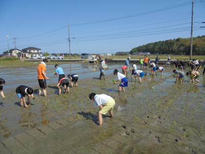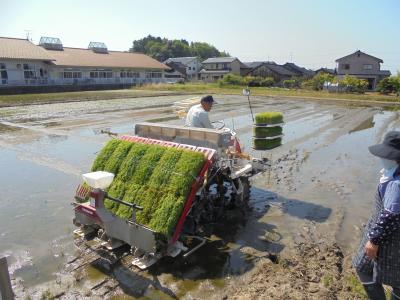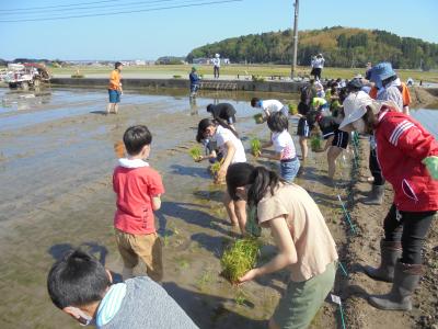 田んぼの先生大浦さんに苗の植え方を教えていただいた後、児童全員が田んぼに入りました。最初はちゅうちょしていたものの、だんだんと田んぼの泥にも慣れてきて、あっという間に植え終わることができました。田植え体験の後は、機械で植えるところも見せていただきました。