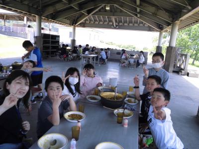ご飯も炊け、カレーが完成した後、広々とそしてさわやかな自然に囲まれたキゴ山で、みんなで美味しくいただきました。自分たちで作ったカレーの味は格別ですね。
