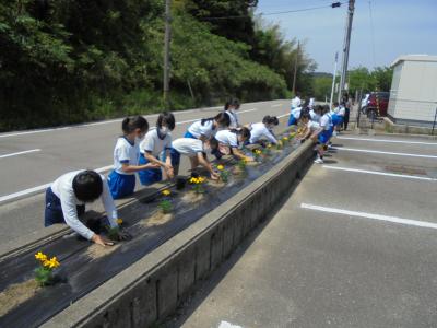 環境委員会の児童を中心に、たくさんの子どもたちに手伝ってもらい、今年もマリーゴールドの苗を植えました。