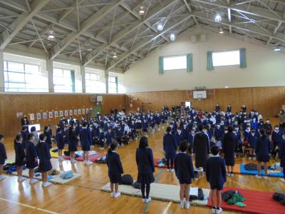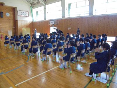 今日は卒業式に出席する4・5年生で全員で、卒業式の在校生練習を行いました。式に出席する際の心構えや姿勢、旅立ちの言葉、歌などの練習を行いました。