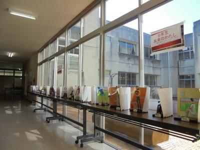 児童玄関横の廊下に,6年生が図工の時間に作成した「未来のわたし」の作品が展示してあります。