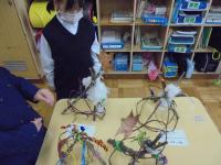 サツマイモのつるで作ったリースやツリーを飾ったり、輪なげ、カードゲームをしたりしました。