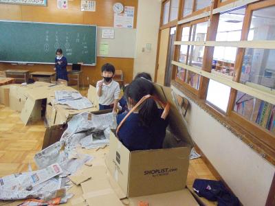 2年生の図工で「だんボールに入ってみると!?」という単元があります。みんなで協力しながら、一つの大きな作品を作り上げていく学習です。