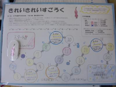 保健給食委員会が中心となり、各クラスでしっかり手洗いができたかどうか確認する「きれいきれいすごろく」を行っています。