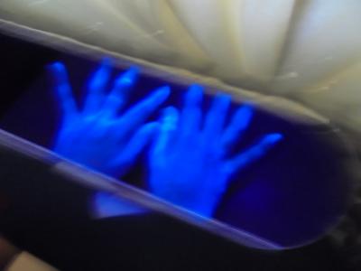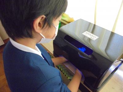 また、各学級では、手洗いチェッカーを使い、手の汚れがきれいに落ちる洗い方について学びました。専用のクリームを手に塗り手洗いをします。クリームがきれいに落ちていれば反応はないのですが、残っているとその部分が白く光ります。いつも通りに洗うと、手の甲や爪先、指の間にクリームが残っていることがわかりました。