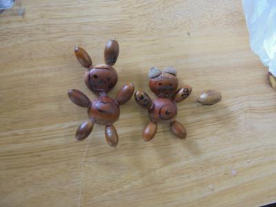 「秋見つけ」で見つけたどんぐりや落ち葉などを使っておもちゃづくりをしました。どんぐりや栗をくっつけて人形を作ったり、竹ひごでつないでやじろべえを作ったりしました。
