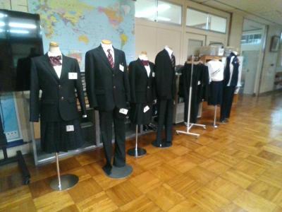 中学校の制服変更に伴い、サンプルが展示されました。男子、女子ともに上着はブレザーそしてチェックのスラックスおよびスカートです。サンプルは2点あり、児童・生徒からアンケートを取って意見などを聞き、どちらかが正式採用となります。