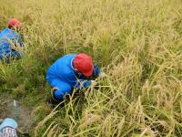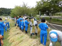 朝からの曇天で雨が心配されたのですが、なんとか雨にあわずにすみました。鎌を使ってどんどん刈り取り、そのあと稲を縄で縛っていきました。この日は、大浦さんだけでなく多くの地域の方々にご協力をいただき、稲の刈り方や縛り方などを教えていただき、無事稲刈りを終えることができました。