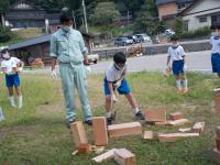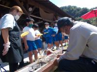午前中は近くにある大海川でのイワナつかみとまき割り体験,野菜収穫体験をしました。昼食はそのイワナと収穫した野菜、そして焼きそばをいただきました。収穫したミニトマトはとても甘く,つかまえたイワナも残さずにいただきました。
