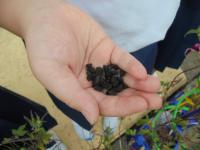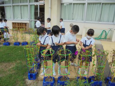 1年生が春から育ててきた朝顔。夏休みの間もお家でお世話をしてくれました。その朝顔がたくさん実をつけました。袋のような実を開くと、そこには種がつまっています。今日はみんなでたねをとりました。子どもたちの手のひらは、あさがおのたねでいっぱいになりました。