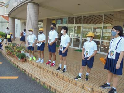 毎朝、児童玄関前で企画委員の児童が中心となって「あいさつ運動」を行っています。
