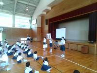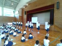 1限目から気温が上がり、体育館には扇風機を複数台設置し、全校集会を行いました。