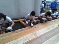 来週のプール開きに向けて、5,6年生でプール掃除を行いました。プール内の床や壁、溝などの汚れをたわしやデッキブラシを使って落としました。