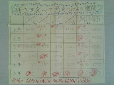 先週一週間取り組んだ残食調査ですが、初日の月曜日と比較し最終日の金曜日には残食が減った学級がかなり増えました。これからも給食を残さず食べて、元気に過ごしましょう。