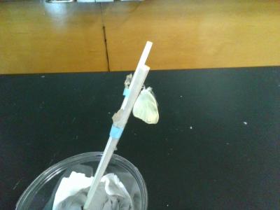 ひと月ほど前、学校園のキャベツに産み付けられていたモンシロチョウの卵を、これまで校長室で育てていました。1ミリにも満たなかった幼虫が、キャベツを食べてみるみる大きくなり、先週サナギになりました。そして今日、そのサナギが無事に羽化し、蝶になりました。羽化の瞬間も動画で撮影することができました。