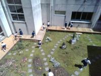 暖かい日差しの中、昼休みの中庭は、遊んでいる子やひなたぼっこをしている子などで賑わっていました。花が咲いて大きくなリ、中庭はとても気持ちの良い場所となっています。