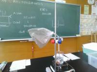 続いて、逆さにした「ろうと」にストローとポリエチレンのふくろを付け、ふっとうしたときに出てくるあわを集めます。しばらく加熱しふっとうすると、ポリエチレンのふくろがくもり始め、やがてふくらみます。そこで火を止め、しぼむのを待つと、ふくろの中には水が集まっています。ぶくぶく出てくる泡の正体も「水」なんですね。正確に言うとあわは「水じょう気」でそれが冷やされて「水」になったんですね。