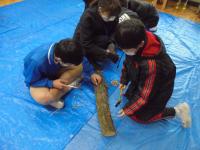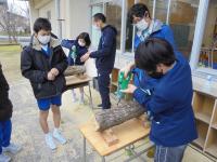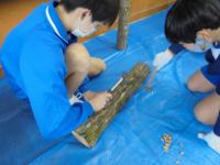 今日は、昨年の11月に切りそろえたしいたけの原木(くぬぎなど)に「コマ」を植え付ける植菌体験学習をしました。ドリルで穴を開けたあと、その穴にしいたけのもととなるコマを詰めていきました。