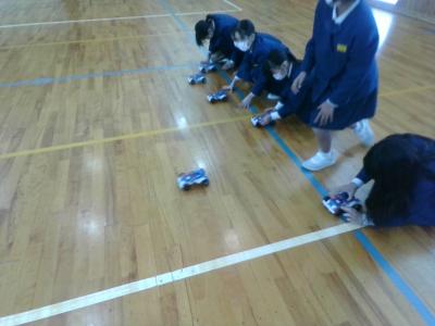 その発展学習として、モーターカーを作りました。これまでに200回巻きコイルを使ってモーターを作ったのですが、今日はそれを使ったモーターカーを体育館で走らせてみました。