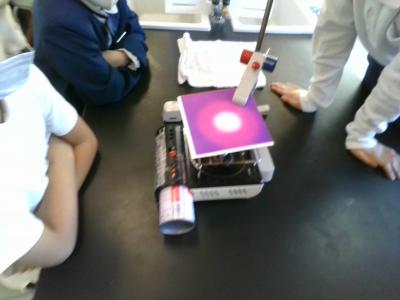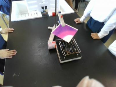 熱が伝わると、紫色だったシールが白っぽく変わります。写真を見ていただくとわかるのですが、鮮やかに変化します。金ぞくは熱せられたところから順に温まっていくことが、一目で分かりますね。