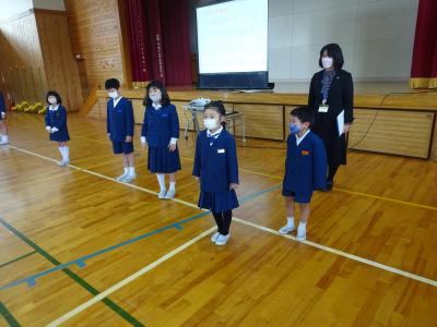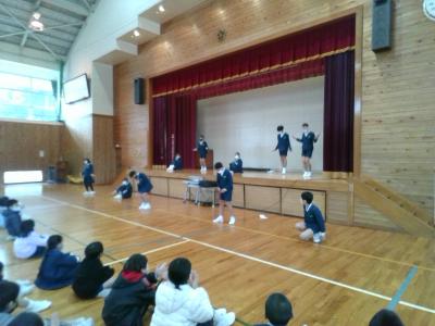 始業式では、なわとび運動に向けて、体育委員会のみんなが技を紹介してくれました。(写真)