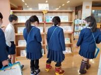 今日は、2年生が生活科の町探検の学習で、町立図書館に行ってきました。施設内を見学したり、職員の方に質問したりしながら、学校の図書館との違いや町の図書館の仕事や役割について調べてきました。