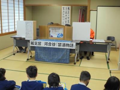 今日は「河合谷禁酒を語り継ぐ会」の方々にお越しいただき、3年生に「禁酒物語」の紙芝居を上演していただきました。