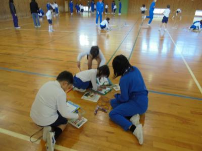 跳んだあとは,回数に合わせてなわとびカードに色を塗っていきます。肌寒い体育館でしたが,子どもたちは元気に運動をしていました。