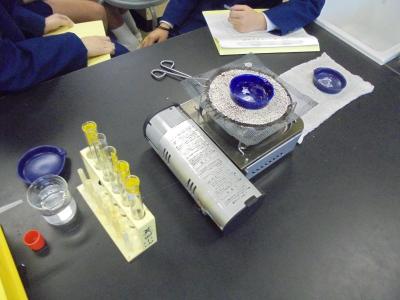 まずは見た目・匂いをよく観察した後、蒸発皿でこれらの水溶液を蒸発させていきます。皿に残って出てきたものが、水溶液に溶けていた物質ということになります。