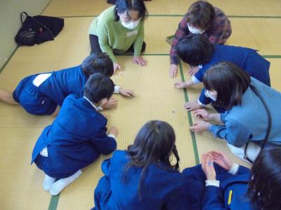 英田コミュニティの和室では,あやとり,お手玉,おはじきを,ホールではめんこ,けん玉,こまを,学校の体育館では竹とんぼの遊び方について教えてもらいました。