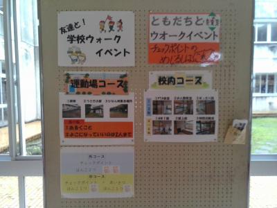 体育委員会の子たちが考えた「友達と学校ウォークイベント」。校内や運動場などのポイントを友だちと回って、そこにある課題をクリアするとスタンプを押すことができます。長休みや昼休みの時間には子多くの子どもたちが取り組んでいました。