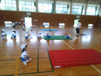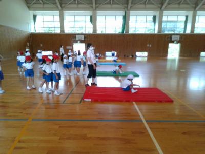 ゆりかごのように前後に体をゆらし、背中を丸めて回る感覚をつかんだあと、前回り(前転)に挑戦しました。はじめは回った後にすっと立ち上がることができず、マットを手でヨイショと押している子が多かったのですが、ゆりかごのときのように足を体に近づけることで、うまくできる子が増えてきました。みんな楽しそうに練習に取り組んでいました。