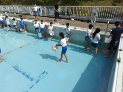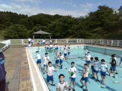 先週のプール掃除に続き、今日は6年生がプール開きを行いました。
