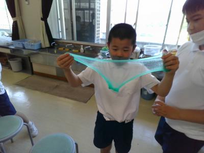 つづいてスーパーボールを作りました。水の代わりに洗濯のりをを使います。絵の具を入れた後にさっきと同じようにホウ砂水溶液を入れてよーーく混ぜます。さらに手でもんでいきます。するとスーパーボールの出来上がりです。スライムよりも粘性が強く、伸びたり弾んだりします。