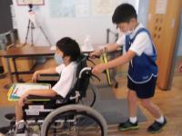 先日、4年生が休館中のシグナスの施設を使って、車いすを使ったバリアフリー体験をしました。ボランティアの方々の協力をいただき、車いすを使って実際にシグナスの中を移動してみました。