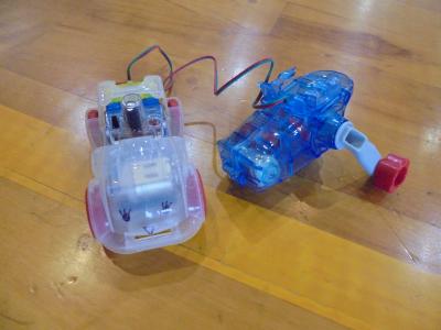 今日は発電した電気をコンデンサーにため,モーターにつなげ車を走らせました。フル充電すると,かなりの距離をかなりのスピードで走らせることができました。