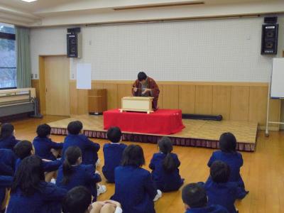 石川県住みます芸人の月亭方気さんをお迎えして行われた「小学生のためのおきらくご」。町内の各小学校を回られ,本校が最後の9校目です。