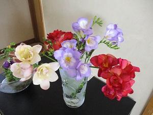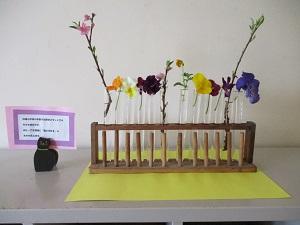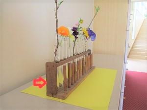 玄関には、とても素敵なお花が飾られています。試験管立てには「種小学校」の文字もうっすら見えて、なんだか種小学校の建物や理科室を思い出しました。とても懐かしく温かい気持ちになりました。